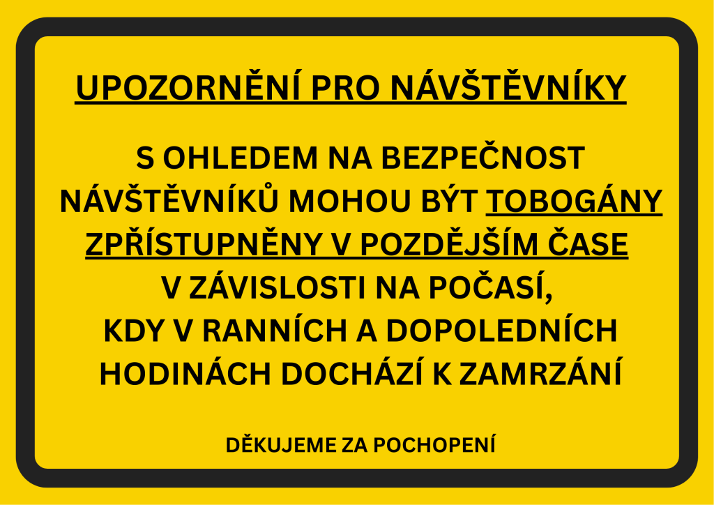Vážení návštěvníci, z důvodu bezpečnosti může dojít k pozdějšímu zpřístupnění tobogánů v závislosti na počasí, kdy v ranních a dopoledních hodinách zůstávají tobogány zamrzlé. Velmi děkujeme za pochopení.